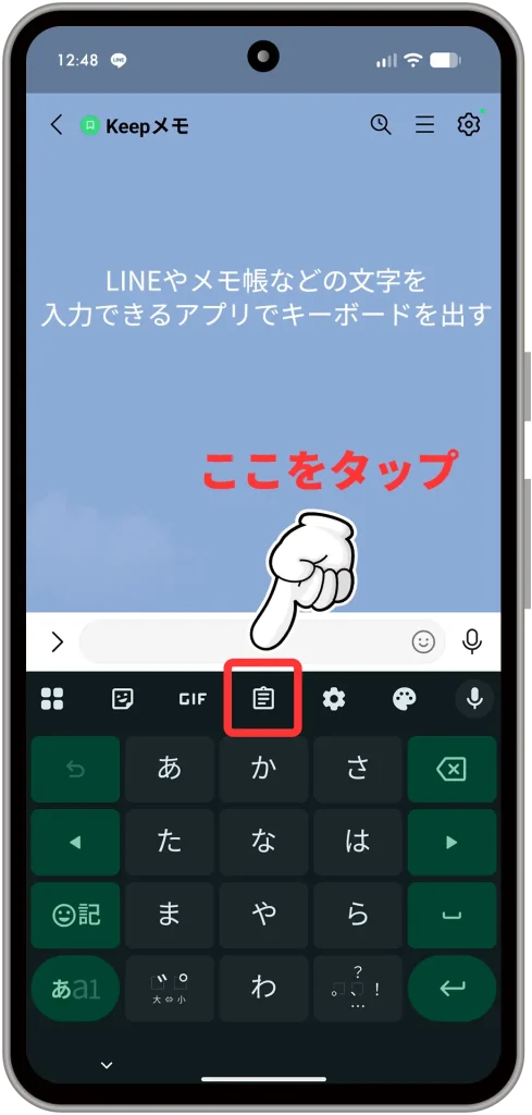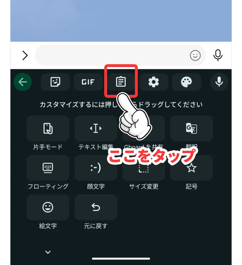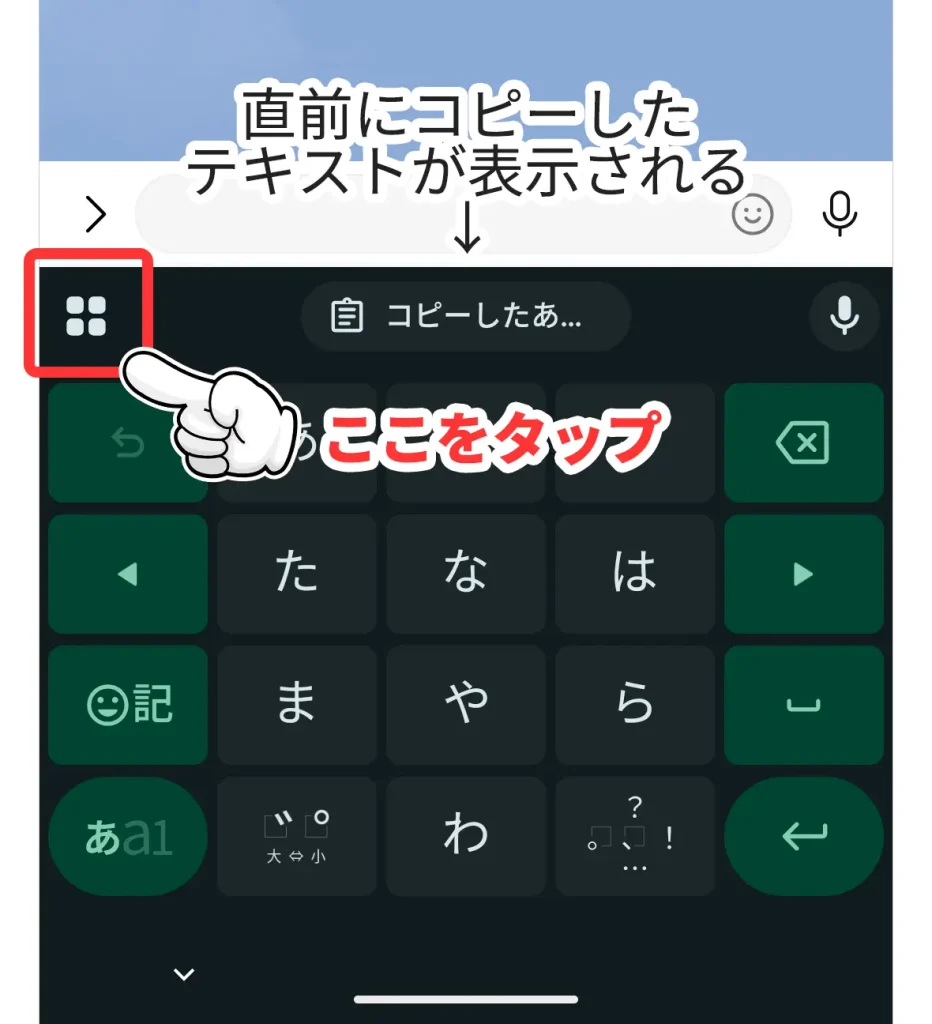 コピーした直後は、コピーした文字が表示されているので、左のアイコンをタップするとクリップボードのアイコンが表示されます。